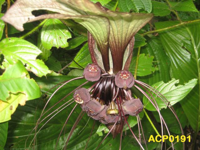 | Huraian | Morfologi: Herba bertuber setinggi 1m. Daun ringkas, berwarna hijau gelap, oblong-ovat, pangkal daun kordat, apeks akuminat, tepi daun licin, berglabrus dan petiol berwarna ungu. Infloresens ungu kemerahan, bentuk yang menarik, keluar daripada tengah roset. |